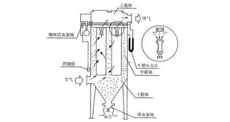 通過噴吹壓縮空氣的方法除掉過濾介質(布袋或濾筒)上附著的粉塵;根據除塵器的大小可能有幾組脈沖閥,由脈沖控制儀或PLC控制,每次開一組脈沖閥來除去它所控制的那部分布袋或濾筒的灰塵,而其他的布袋或濾筒正常工作,隔一段時間后下一組脈沖閥打開,清理下一部分除塵器由灰斗、上箱體、中箱體、下箱體等部分組成,上、中、下箱體為分室結構。工作時,含塵氣體由進風道進入灰斗,粗塵粒直接落入灰斗底部,細塵粒隨氣流轉折向上進入中、下箱體,粉塵積附在濾袋外表面,過濾后的氣體進入上箱體至凈氣集合管-排風道,經排風機排至大氣。 清灰過程是先切斷該室的凈氣出口風道,使該室的布袋處于無氣流通過的狀態(tài)(分室停風清灰)。